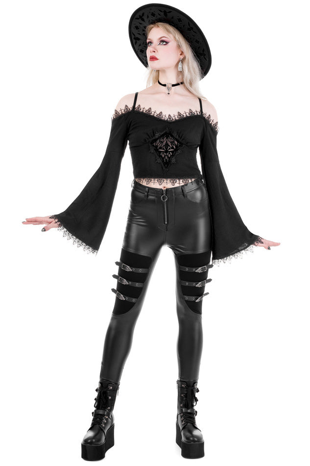 ⋆ Contrast thigh panels with custom Cathedral buckles, PU leather straps, and eyelets for a rebellious edge