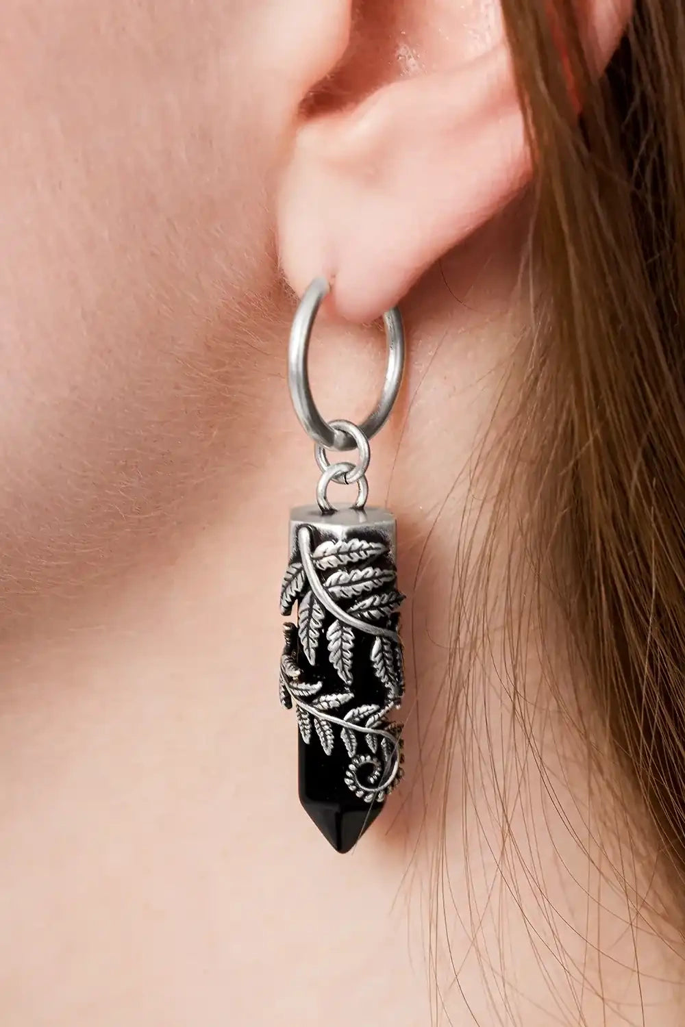 The crystal hangs from a silver-tone hoop and moves gently with every step. The earrings blend dark boho style with botanical symbolism. Ideal for those who love pagan jewelry or magical accessories inspired by nature. A striking choice for witchy outfits and whimsigoth fashion.