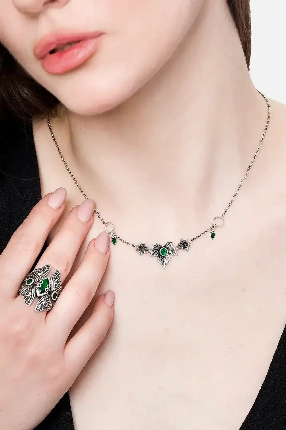 This medium-length ivy leaf necklace features intricate magical detailing with a subtle, enchanted feel. A large sculpted leaf pendant forms the centrepiece, set with a faceted emerald-green glass stone. Two matching marquise-shaped charms add balance and shimmer to the design 🖤