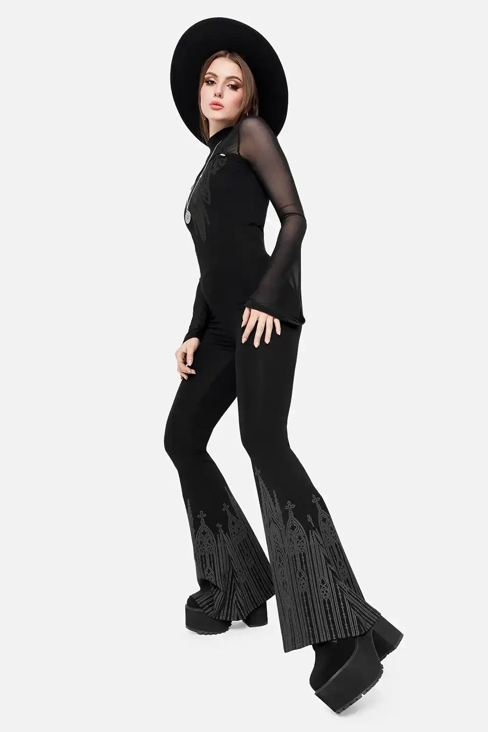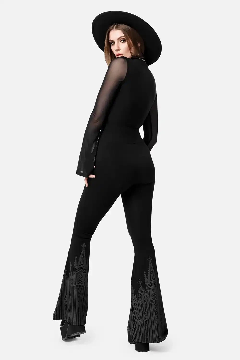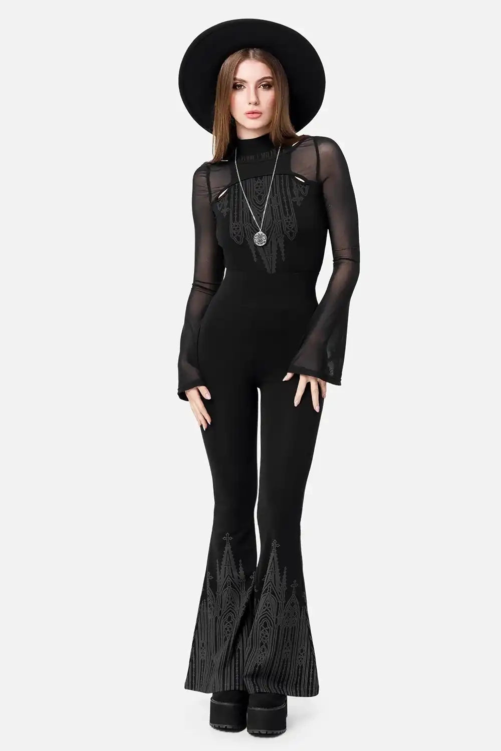 This gothic top with cathedral print is made to enchant with its elegant design. Sheer mesh flared sleeves bring a dramatic, flowing elegance to the look. The high neck adds bold, witchy sophistication. Cut-out details at the chest and shoulders complete this alternative fashion statement. Perfect for lovers of dark romantic and corpo goth style.