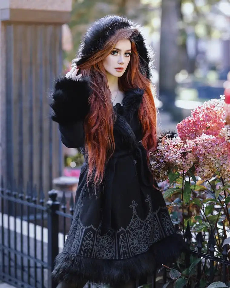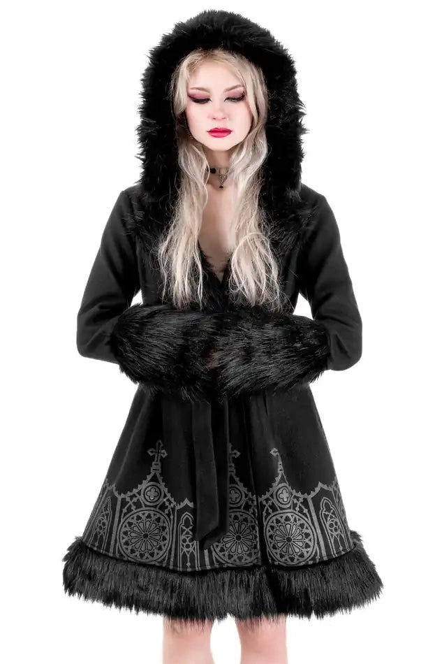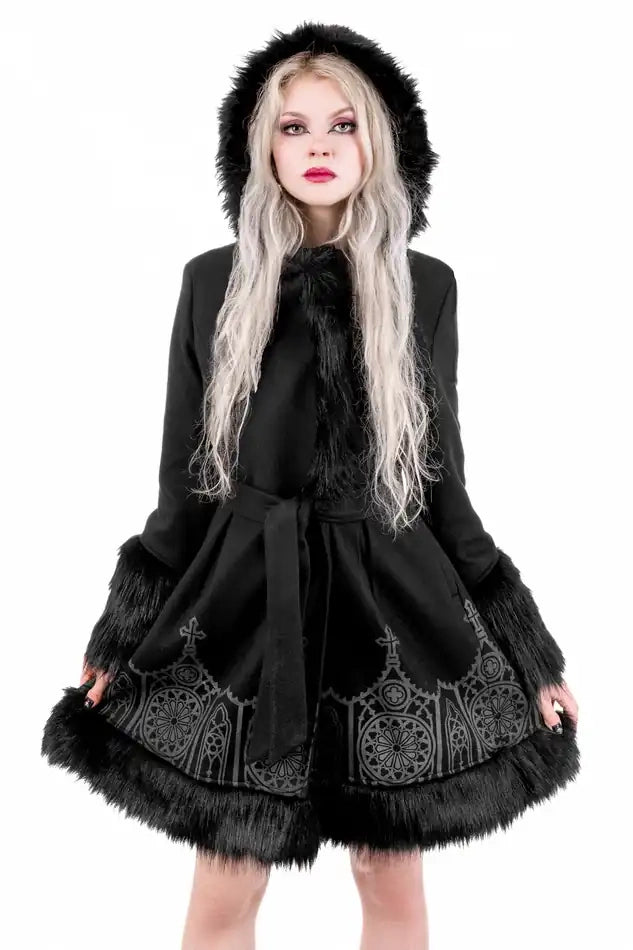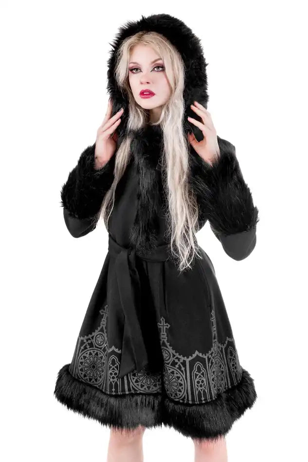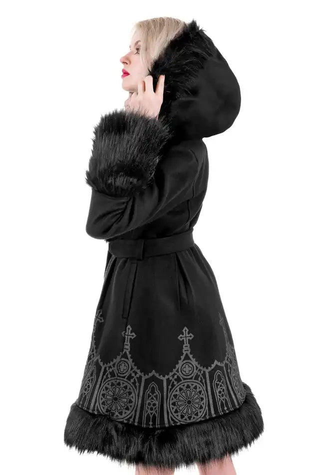 Our vintage-inspired gothic swing coat is a masterpiece of winter elegance. It features detailed arches, spires, and rose windows reminiscent of a snow-covered castle. The Dark Altar Coat adds a touch of regal charm to any winter wardrobe.