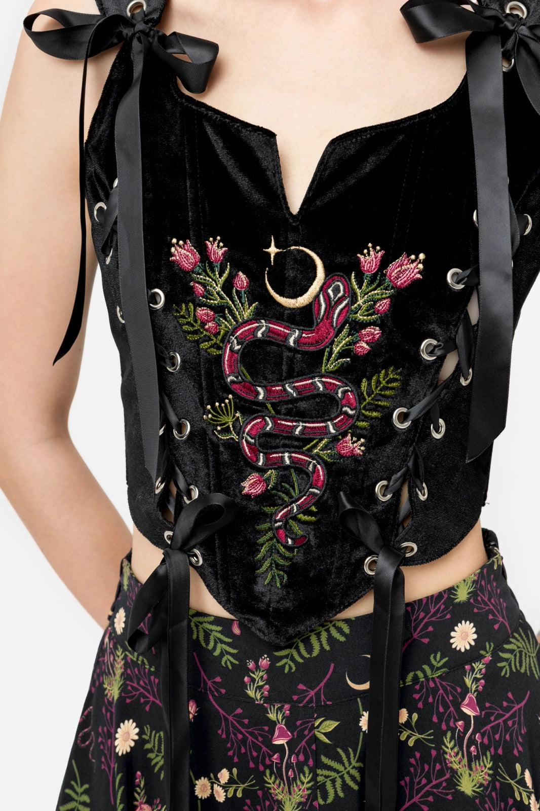 The Enchanted Encounters Corset Top is where beauty slithers in the dark. Featuring the wildest embroidery, a serpent winding through woodland plants, it’s a bold statement of nature's spirit.