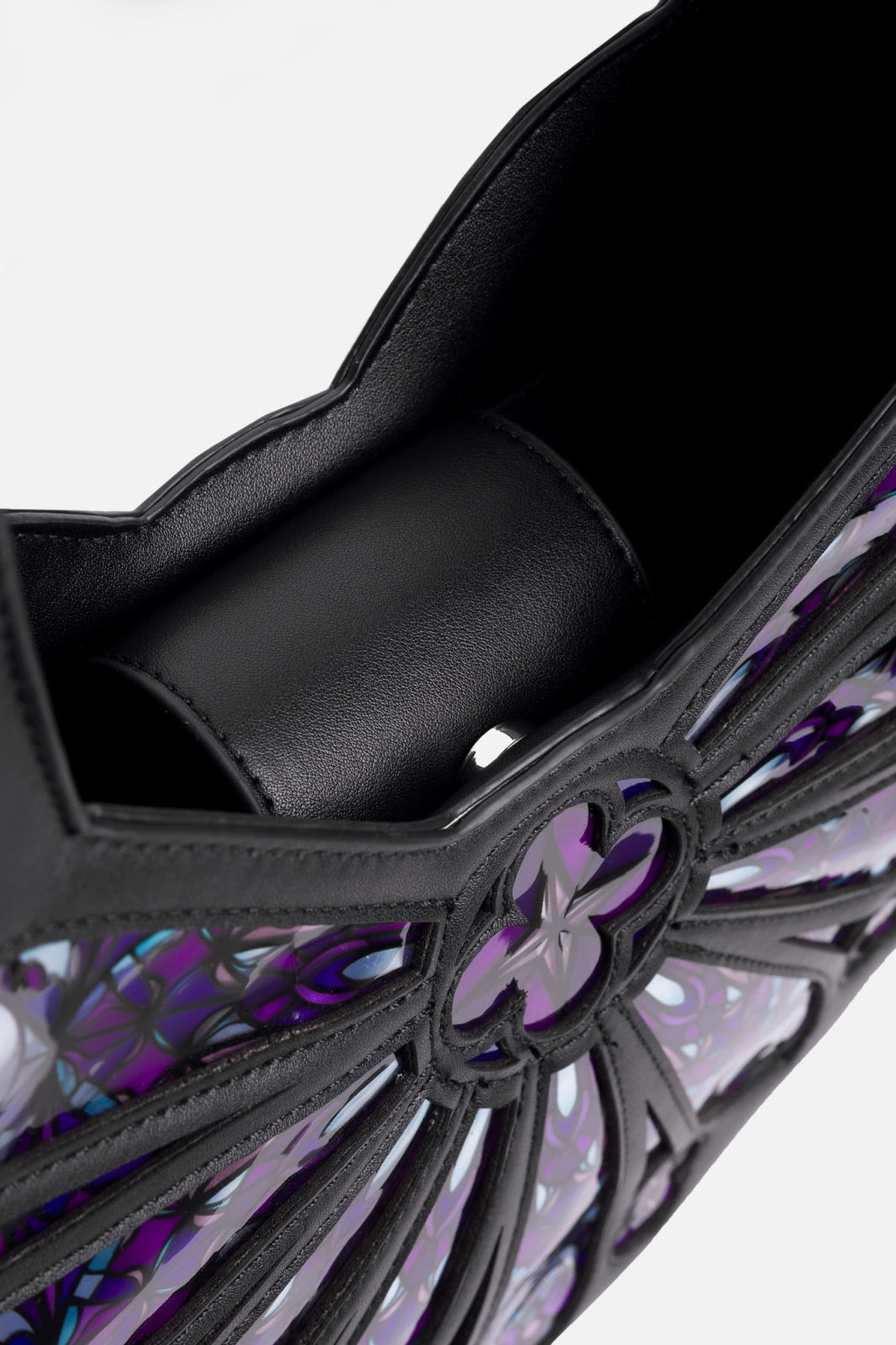 This purple stained glass bag draws inspiration from cathedrals and the mystical beauty of rose windows. Designed to reflect the light, its surface shimmers in radiant colors, as if you were gazing through stained glass. This unique accessory feels more like a precious object than a simple handbag – ornamental, symbolic, and full of dark elegance.