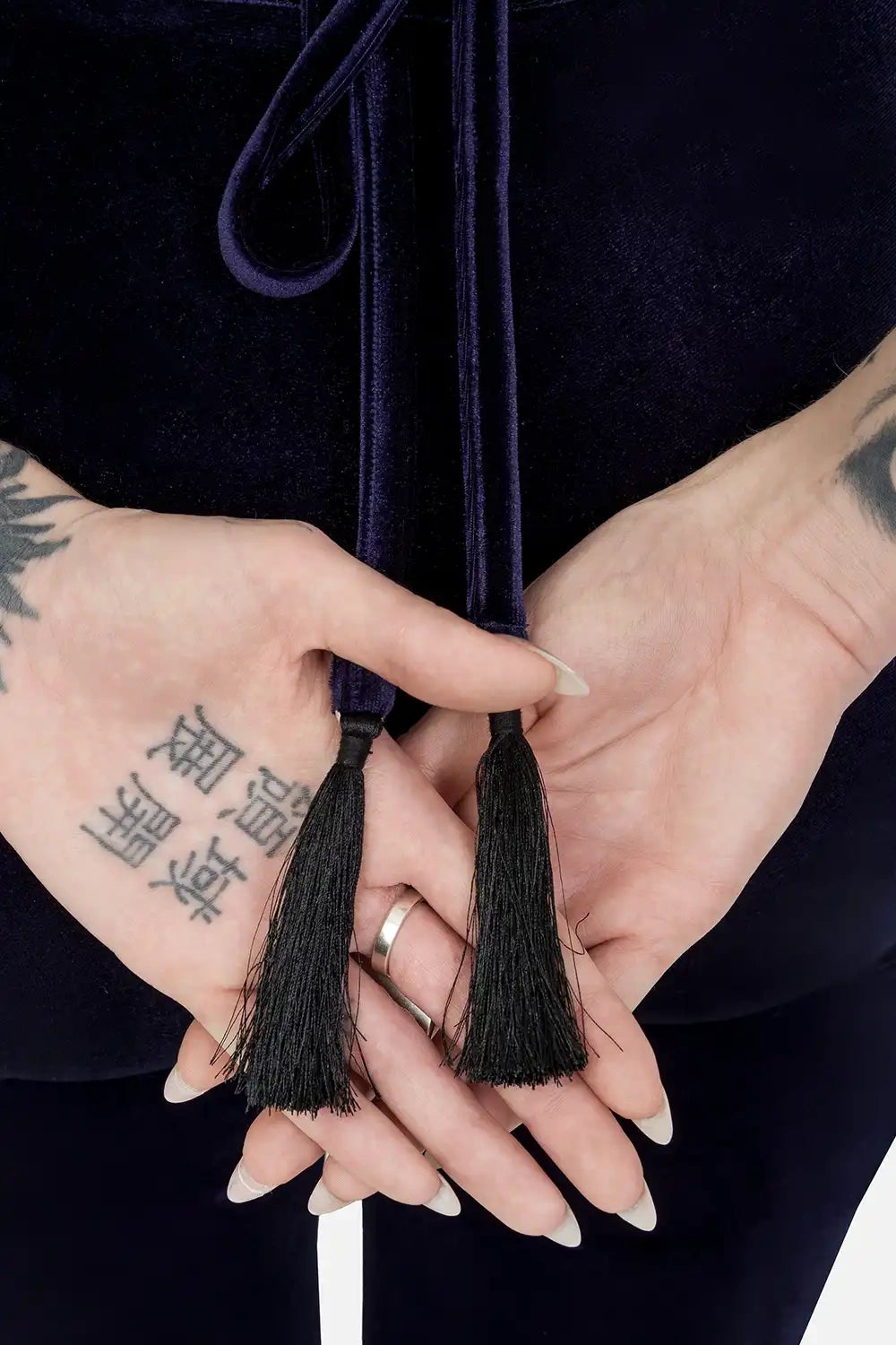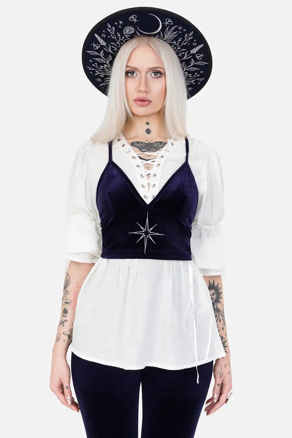 Elegant yet otherworldly, this dark blue velvet cami top with silver star blends celestial, bohemian, and whimsigoth influences. It’s a statement piece for those who find magic in starlight, romance in shadow, and beauty in the night.