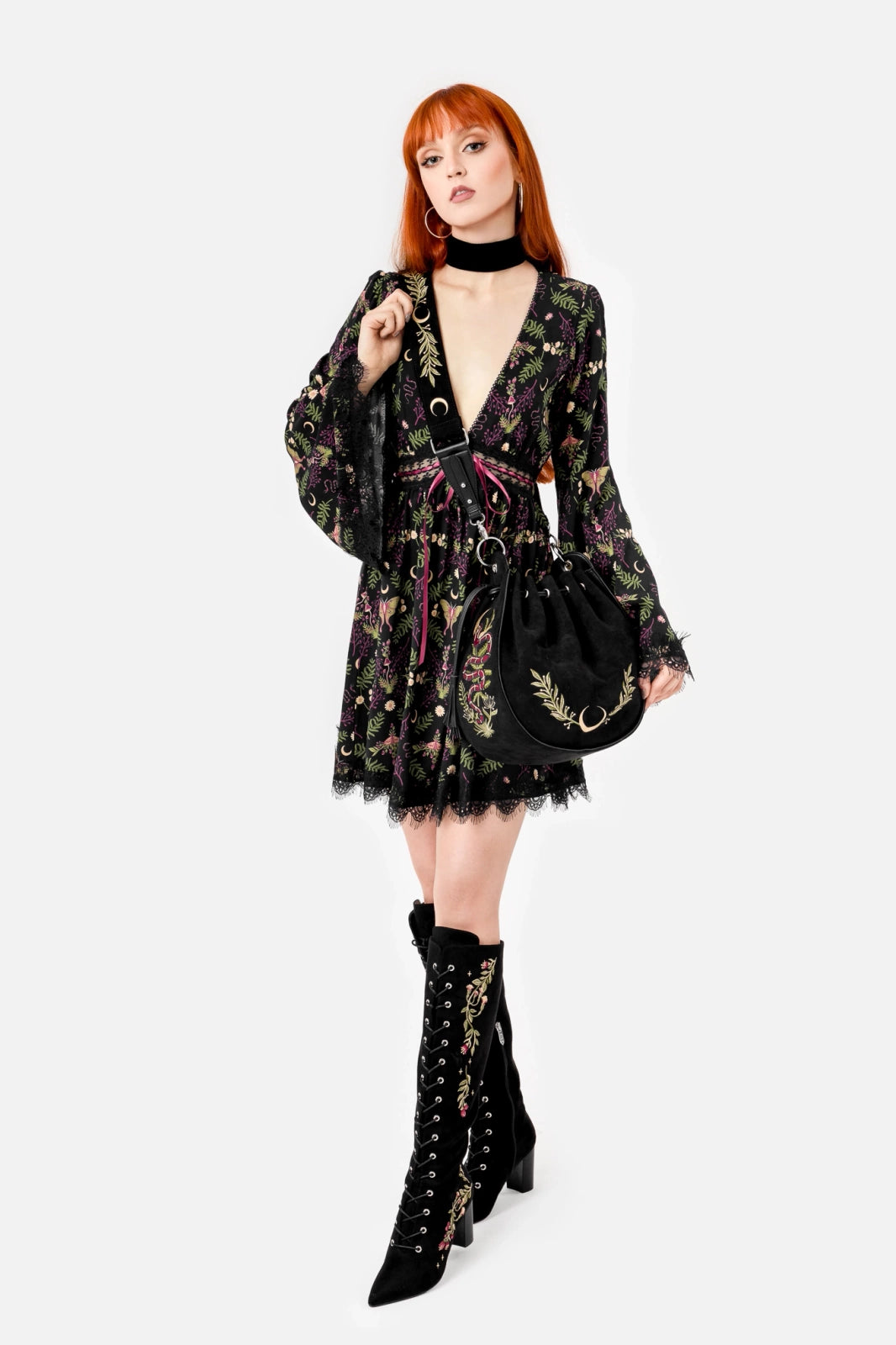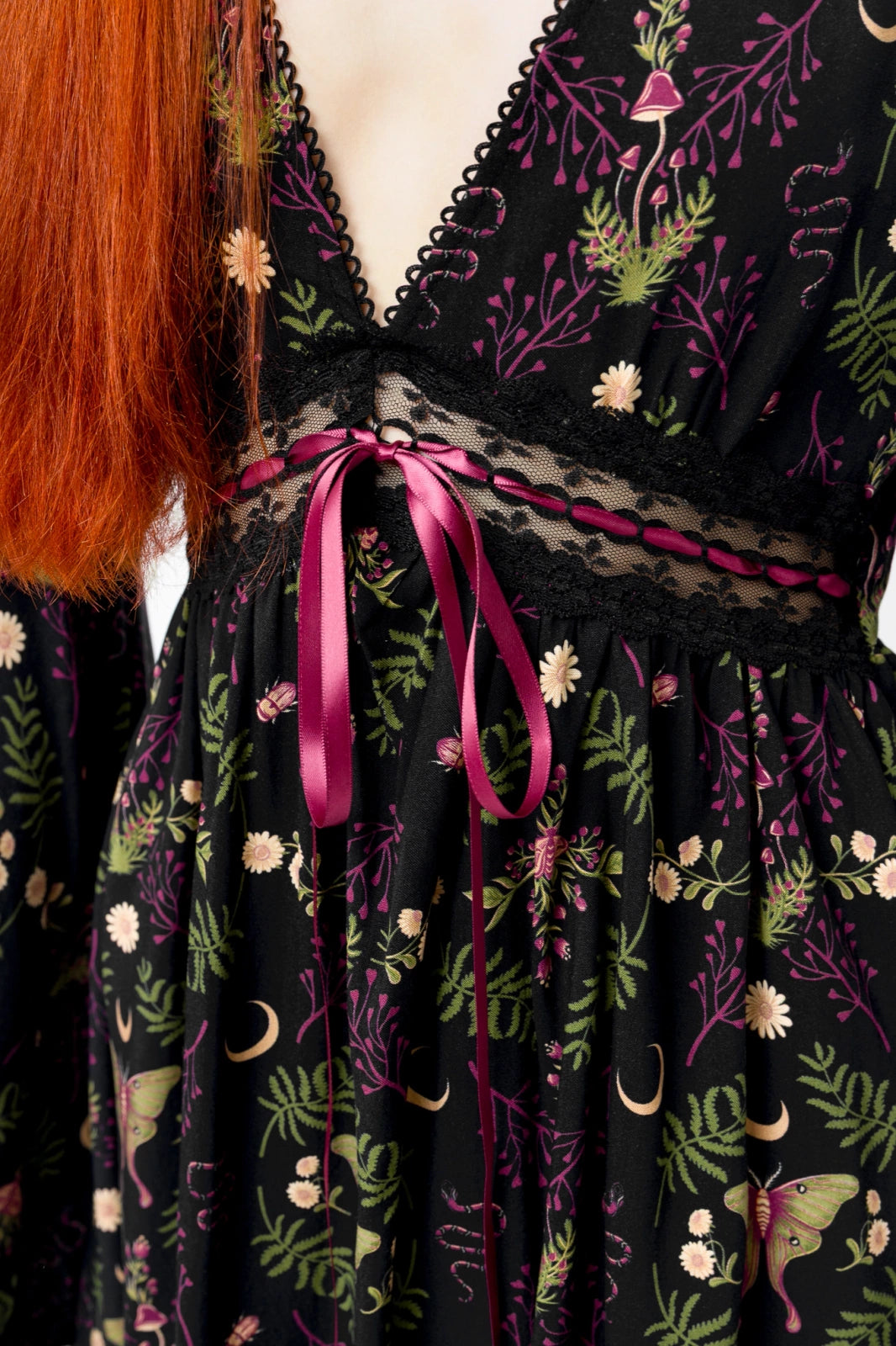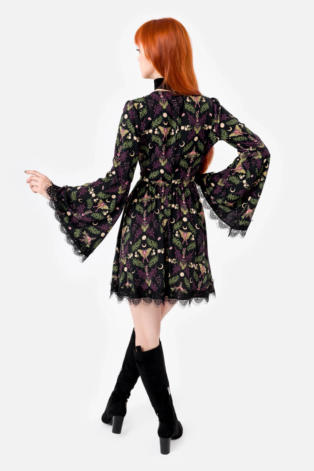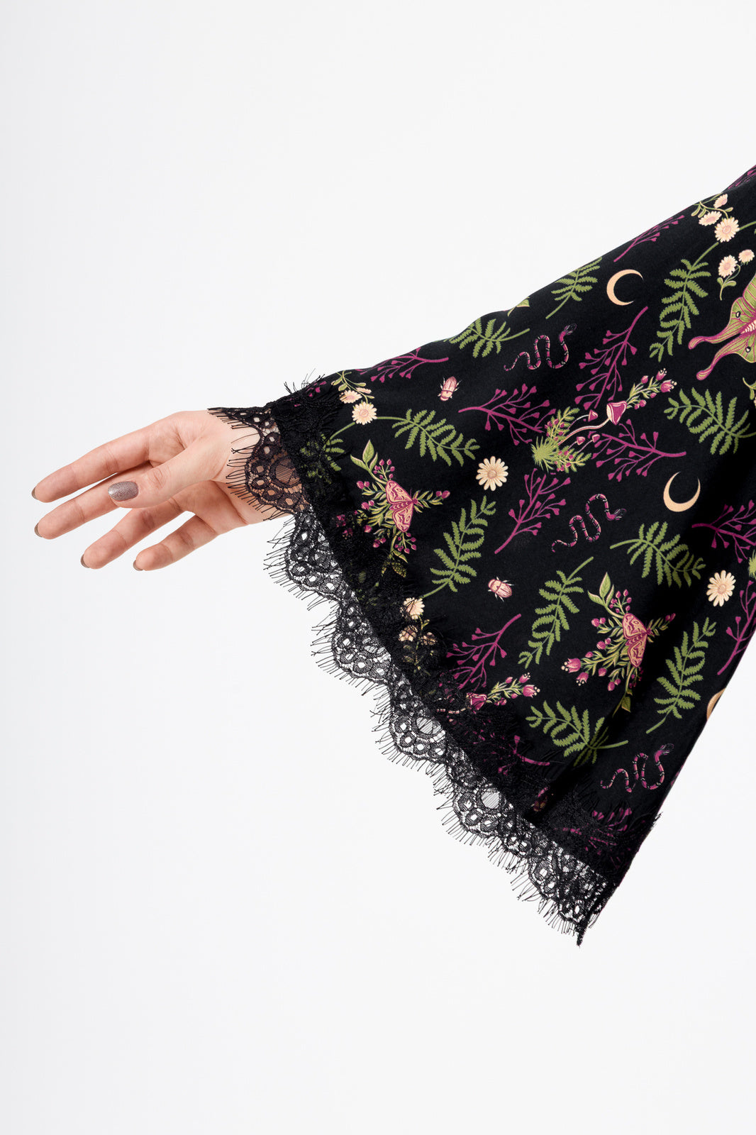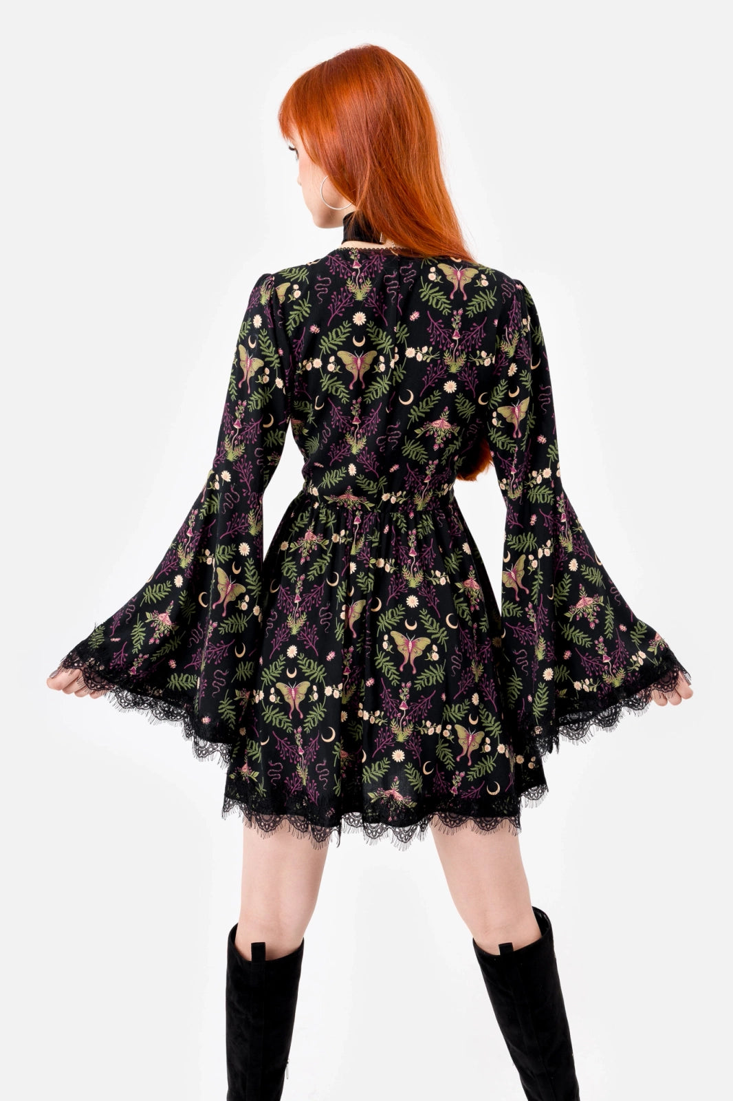 The Wilderwood Mini Dress is adorned with delicate moths, snakes, and wild flora – symbols of transformation and the unseen. Perfect for those who find beauty in the darkness and whose souls are as untamed as the whispering woods.